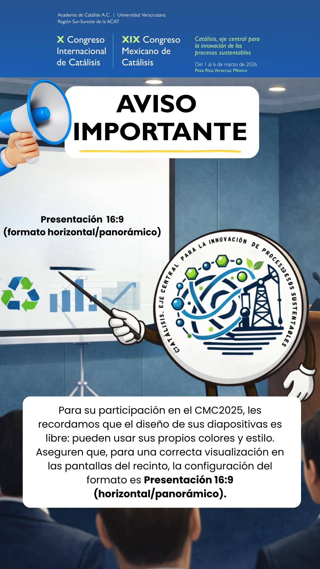 El X Congreso Internacional y XIX Congreso Mexicano de Catálisis (CMC2025) tiene como objetivo reunir a la comunidad científica nacional e internacional especializada o interesada en áreas afines a la catálisis para analizar e intercambiar ideas, realizar actividades de investigación y fomentar la cooperación entre los individuos y los diversos grupos de investigación de México y del mundo para: